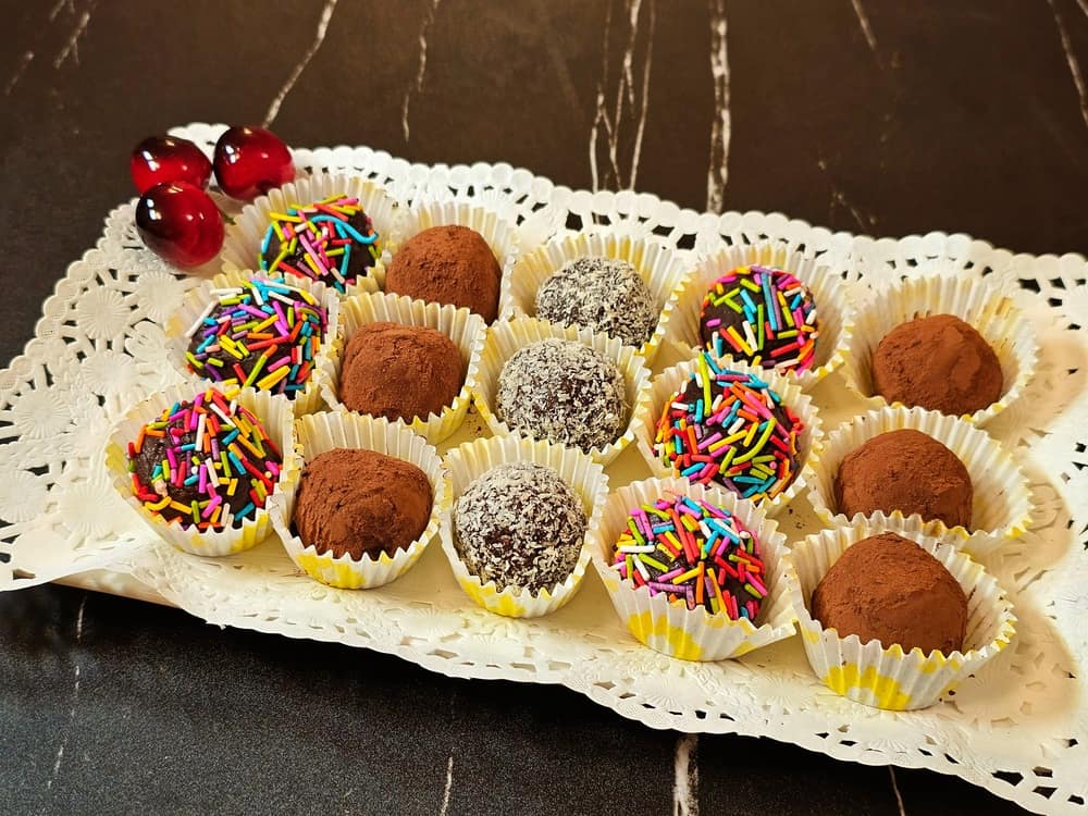 מעבירים לקערה. בעזרת כף עוגיות בקוטר של 3 ס”מ קורצים עיגולים, מגלגלים בין כפות הידיים לכדור, מגלגלים באבקת קקאו מנופה, קוקוס מגורר, סוכריות צבעוניות או אגוזי לוז קלויים וטחונים גס.
