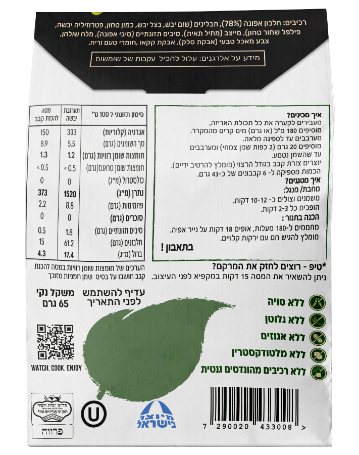 • מנות מאוזנות: שקית של 65 גרם של תערובת קבב טבעונית מספיקה לשישה שיפודים של 130 גרם, אידיאליים לארוחות משפחתיות.